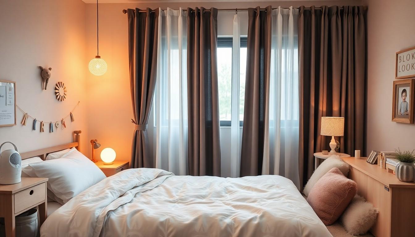 A sleep-conducive bedroom maintains a temperature between 68-72°F (20-22°C) with humidity levels at 30-50%. Blackout curtains block disruptive light while white noise machines mask sudden sounds at 50-60 decibels. Soft, breathable bedding in calming colors like blue, green or lavender promotes comfort. Essential oil diffusers with chamomile or lavender create gentle aromatherapy at low settings. Dimmed lighting through warm-colored bulbs signals the body to produce melatonin. Night lights with red wavelengths provide visibility without disrupting sleep cycles.