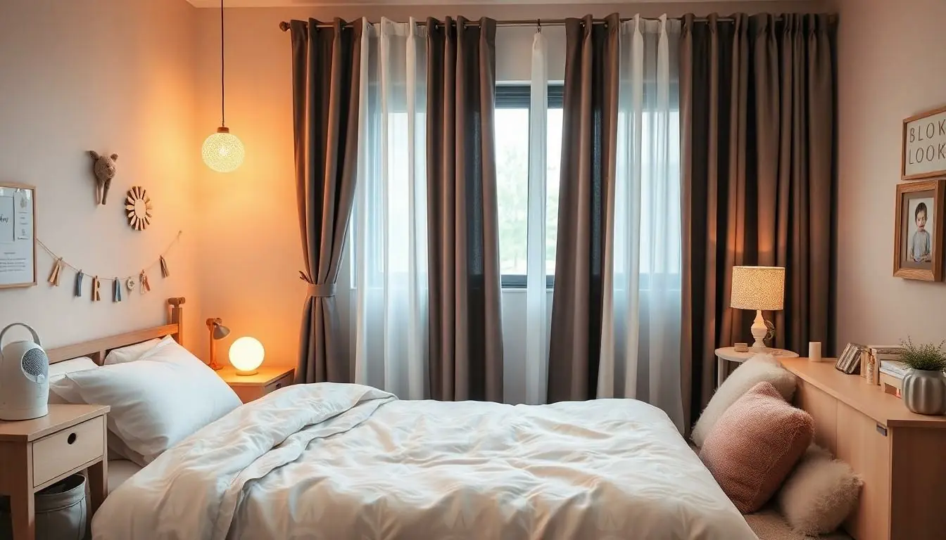 A sleep-conducive bedroom maintains a temperature between 68-72°F (20-22°C) with humidity levels at 30-50%. Blackout curtains block disruptive light while white noise machines mask sudden sounds at 50-60 decibels. Soft, breathable bedding in calming colors like blue, green or lavender promotes comfort. Essential oil diffusers with chamomile or lavender create gentle aromatherapy at low settings. Dimmed lighting through warm-colored bulbs signals the body to produce melatonin. Night lights with red wavelengths provide visibility without disrupting sleep cycles.